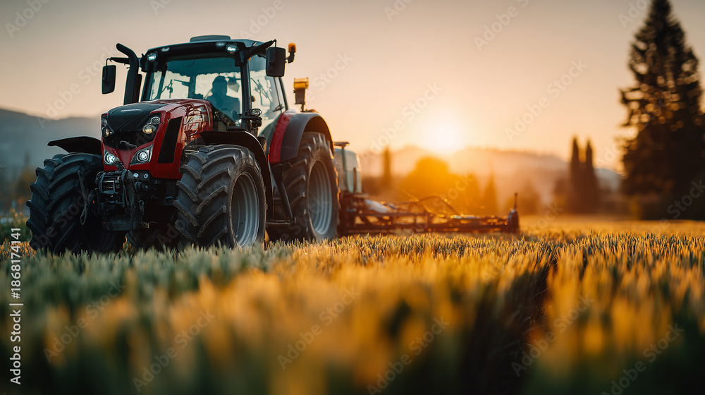 Powerful red tractor in wheat field during sunrise, modern agricultural machinery in scenic farmland #1868174141