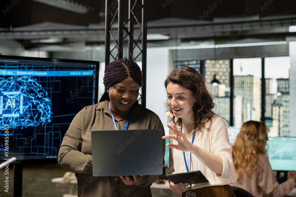 Powerful team of diverse associates review AI generated analytics from TV monitor, applying machine learning tools and neural networks to drive development and achieve corporate goals. #1769855883