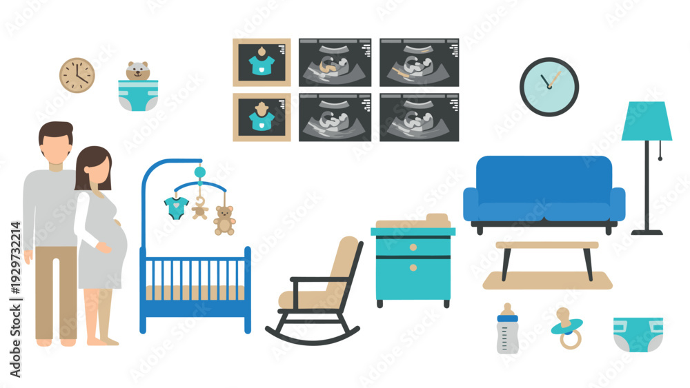 pregnant couple with baby nursery furniture and ultrasound scans hand drawn flat icons set #1929732214