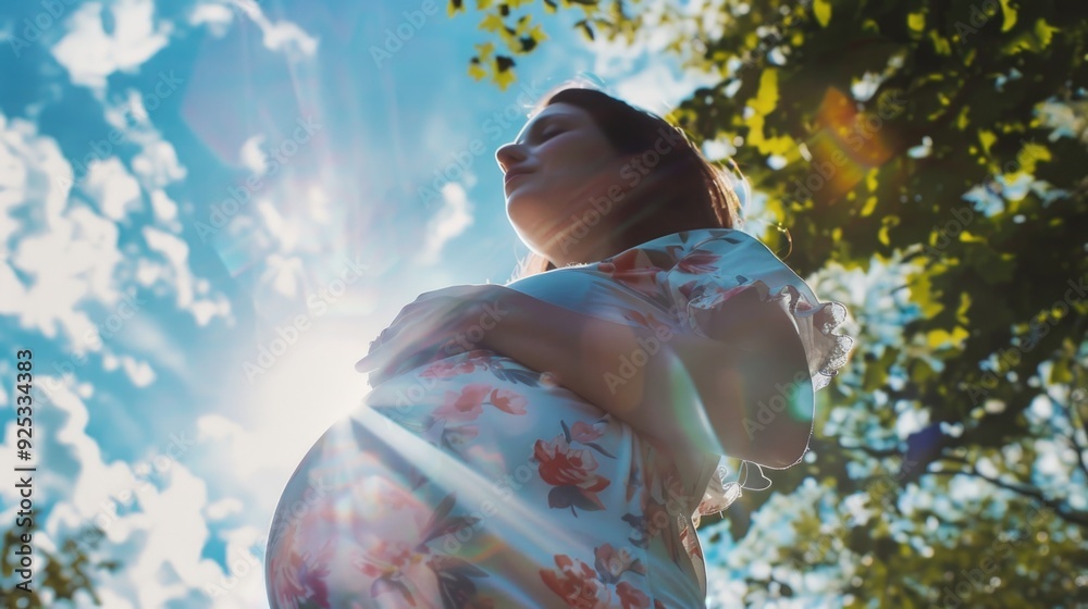 Pregnant woman enjoying outdoor sunlight, likely in springtime. #925334383