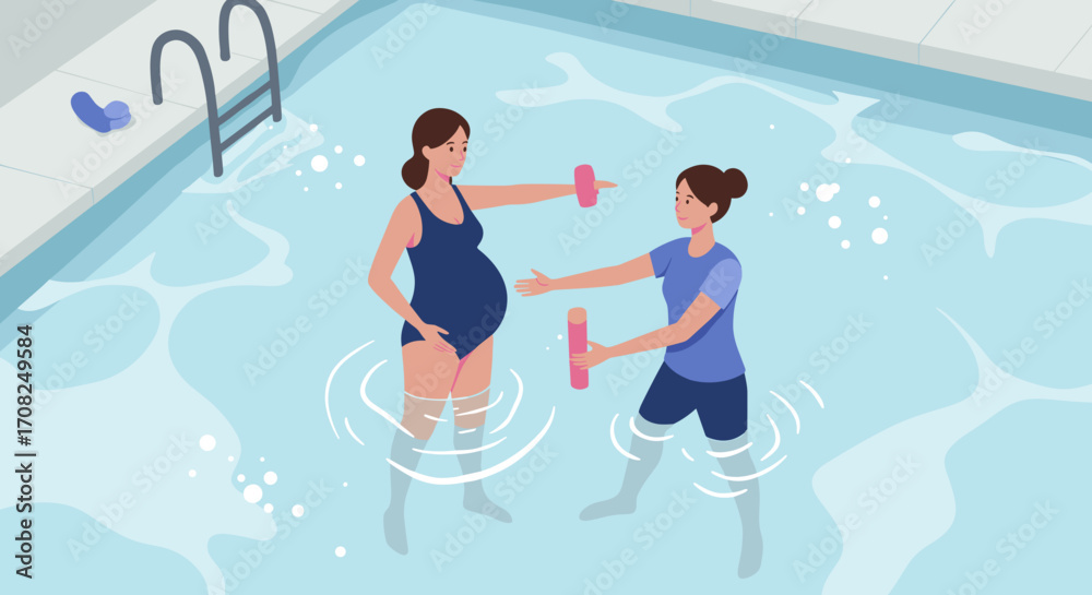 Pregnant woman exercising with weights in pool with instructor #1708249584