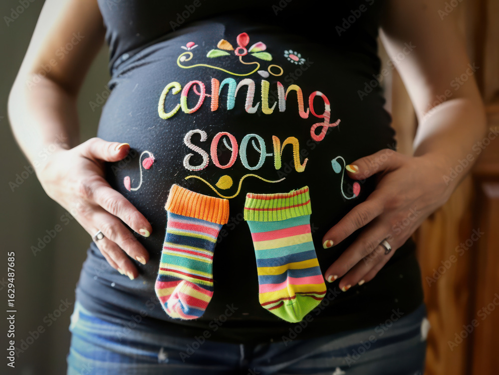 Pregnant woman with coming soon shirt and baby socks anticipating new arrival of her child soon #1629487685
