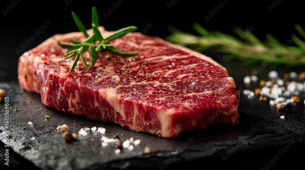 Premium marbled wagyu beef steak on dark slate #1611569805
