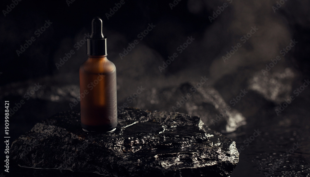 Premium men's grooming oil bottle on dark stone with atmospheric smoky effect #1909988421