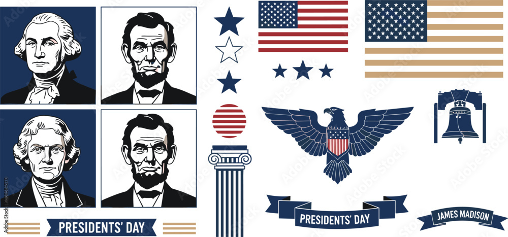 Presidents Day collage vector, historical portraits, patriotic USA symbols, American flag theme, red white blue design, flat vector illustration #1880584570