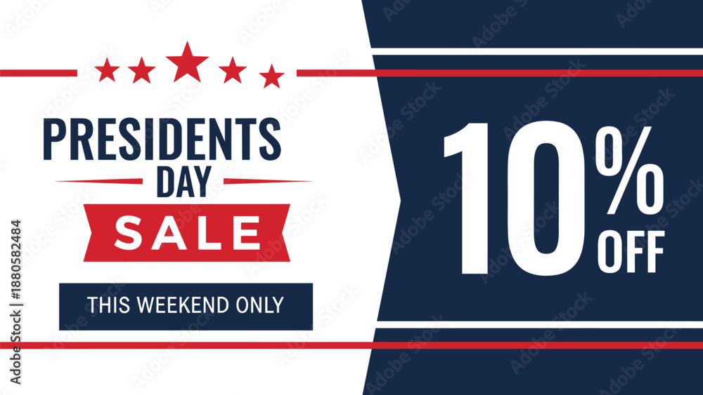 Presidents Day sale ad, 10% off promotion, patriotic stars and stripes, red white blue theme, flat vector illustration #1880582484