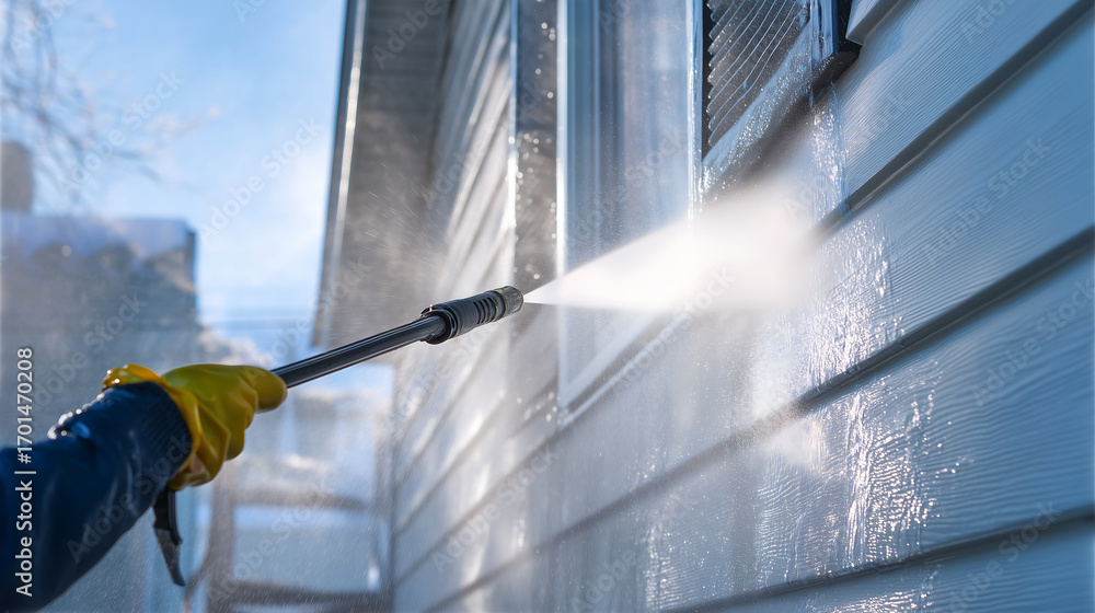 Pressure washing house siding with water spray, home exterior cleaning service #1701470208
