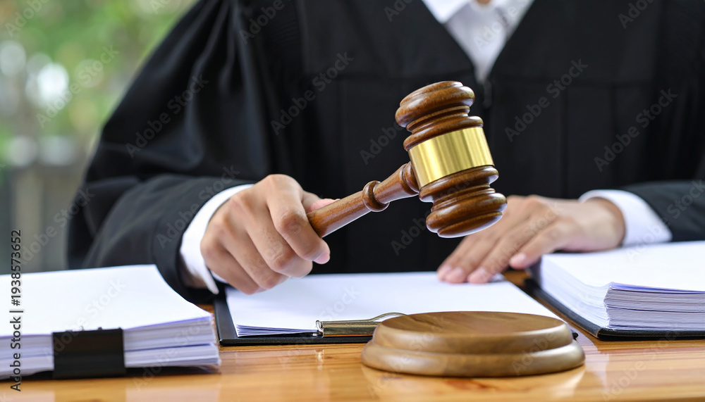 Primer plano de la mano de un juez con toga negra sosteniendo un mazo sobre la mesa del tribunal en juicio, concepto de justicia, ley, sistema judicial, autoridad legal, veredicto, tribunal #1938573652