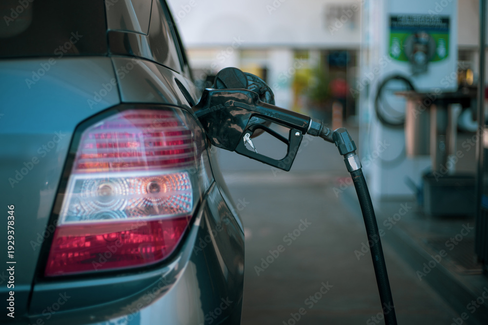 Primer plano de manguera de combustible surtiendo gasolina a un coche en una estación de servicio #1929378346