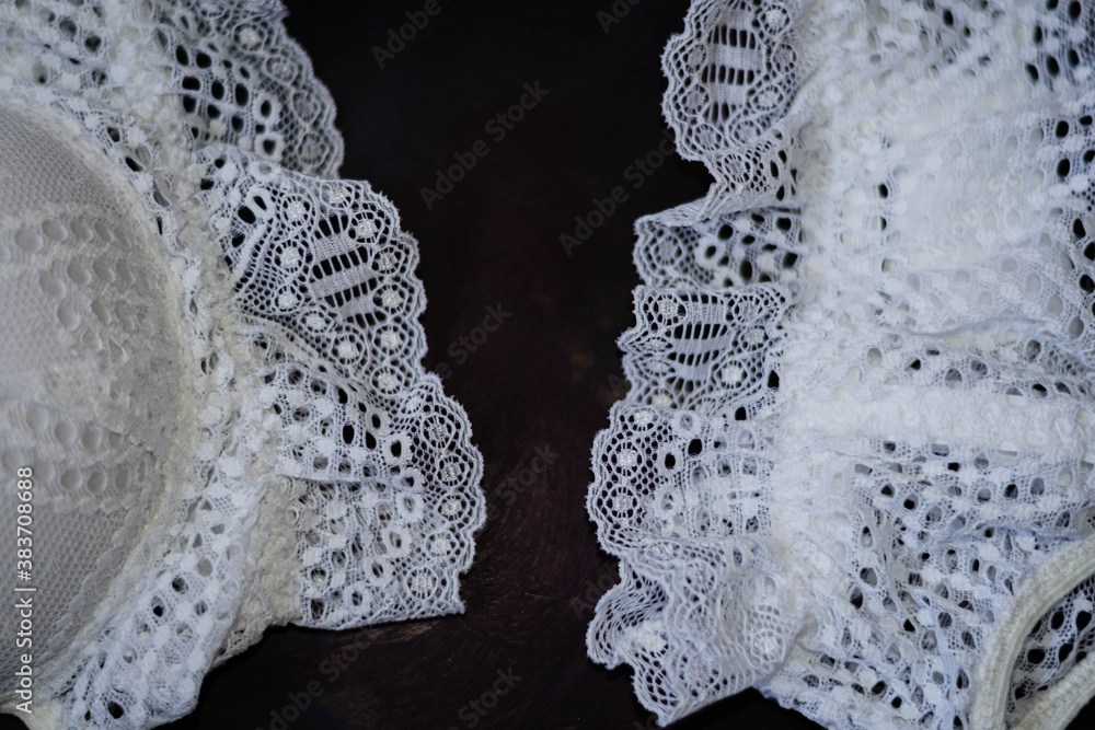 primer plano de ropa interior femenina bombacha y corpiño en su confección con hilos maquina de coser con base oscura #383708688