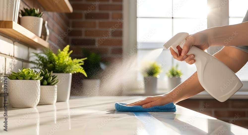 Primer plano de una mujer adulta limpiando una mesa de mármol blanco con un paño azul y una botella de spray en casa, desinfectando superficies para la higiene, luz brillante de la mañana en el interi #1931393761