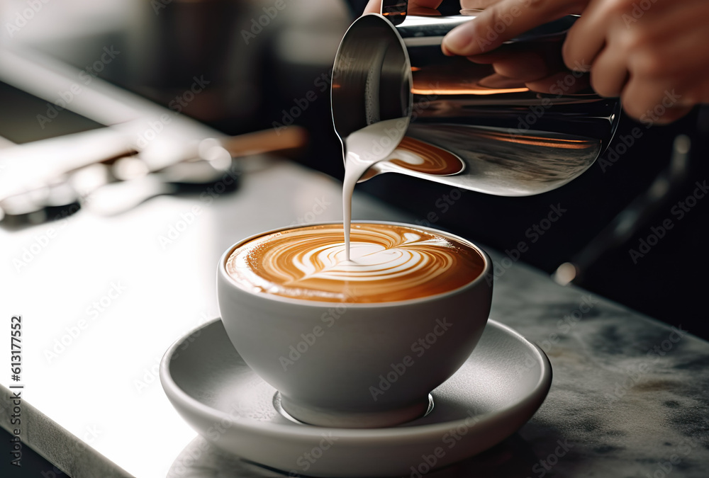 primer plano de unas manos de camarero o barista echando leche en una taza con cafe, haciendo un dibujo decorativo. Concepto de negocios #613177552