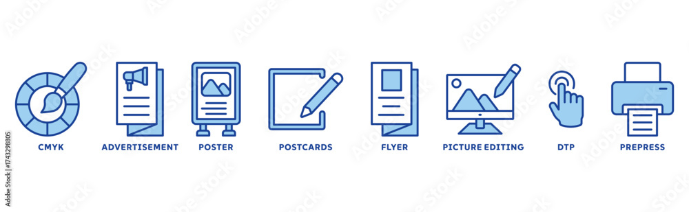 Print icon set illustration concept with icon of flyer, advertisement, poster, postcards, CMYK, picture editing, DTP, prepress #1743298805