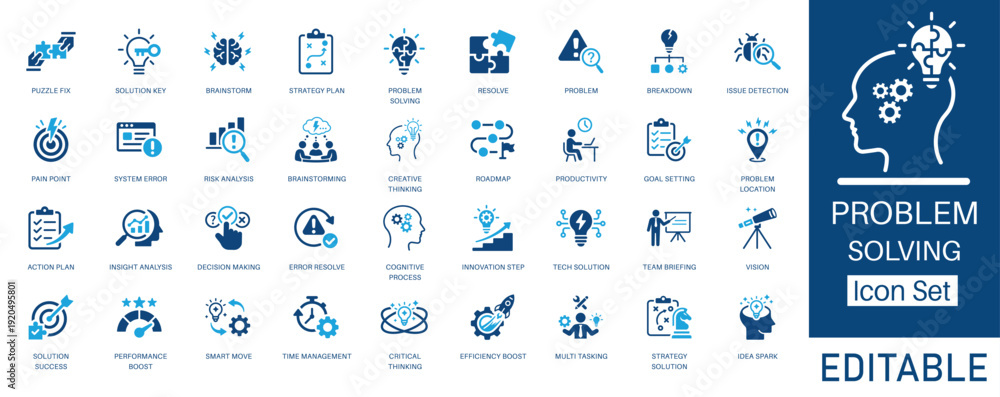 Problem Solving and Strategy icon set. Featuring Risk Analysis, Brainstorming, Creative Thinking, and Decision Making. Solid glyph vector icons for corporate, management, and business strategy project #1920495801
