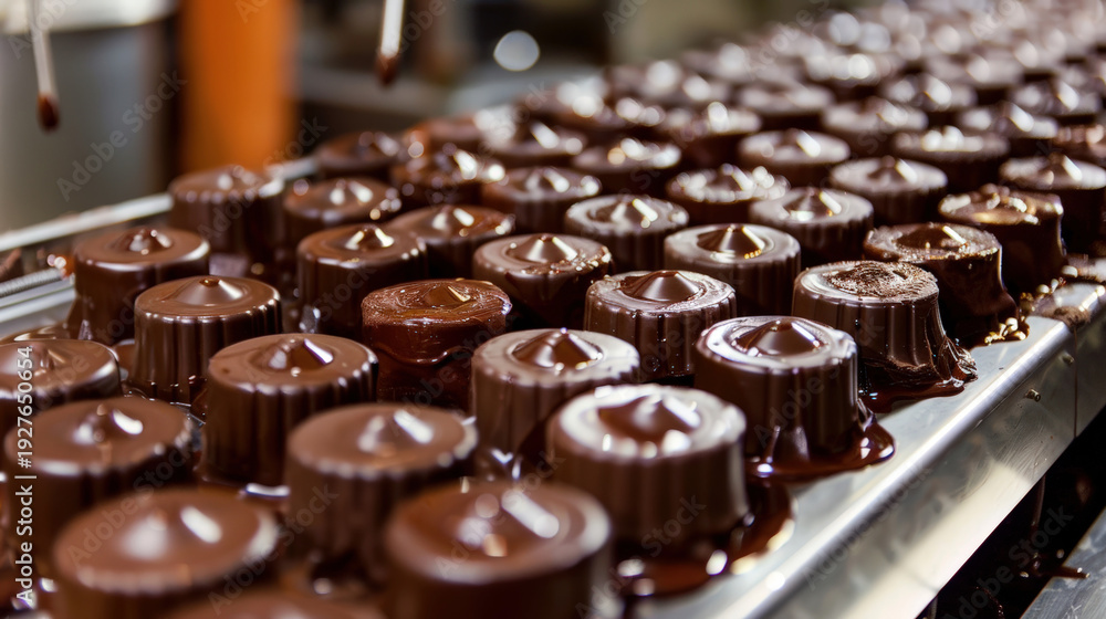 Process of bottling of chocolate into candy molds on production line. Chocolate candies on conveyor belt in factory. Modern technologies. Close-up #1927650654