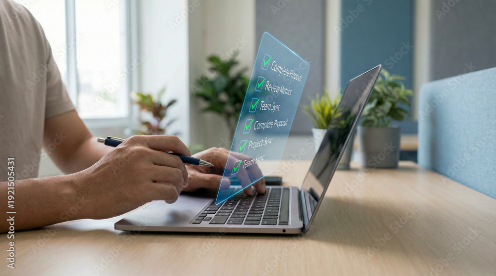 Profesional trabajando en portátil con checklist digital flotante. Concepto de productividad, gestión de tareas y cumplimiento de objetivos empresariales. #1921505431