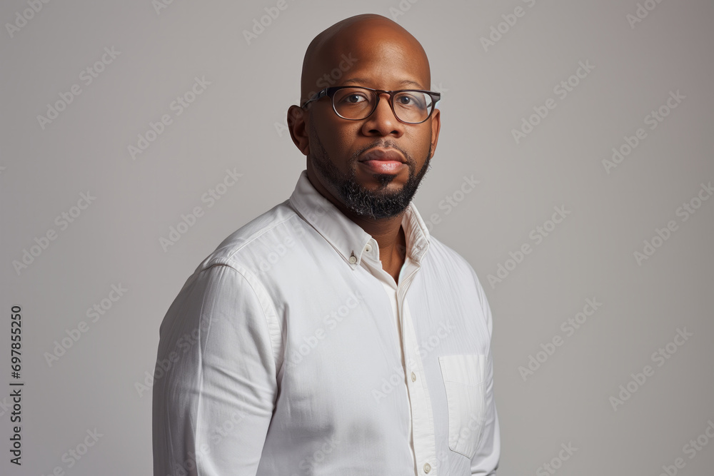 Professional African-American businessman of middle age, in casual office style and strict glasses, gray empty background, copy space - executive manager, proud lawyer, businessman leader #697855250