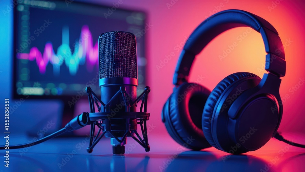 Professional audio recording setup featuring a studio microphone and headphones with a visualizer display #1552836551