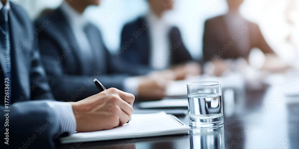 Professional business meeting with participants taking notes at a conference table. #1772613673