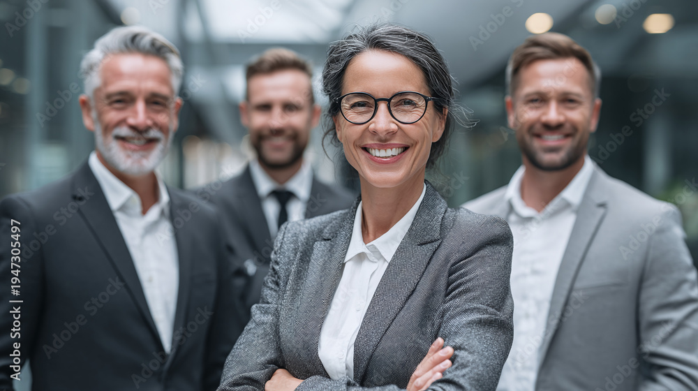 professional business team portrait in modern corporate office featuring smiling executives in suits expressing teamwork leadership confidence and company achievement through strong collaboration #1947305497