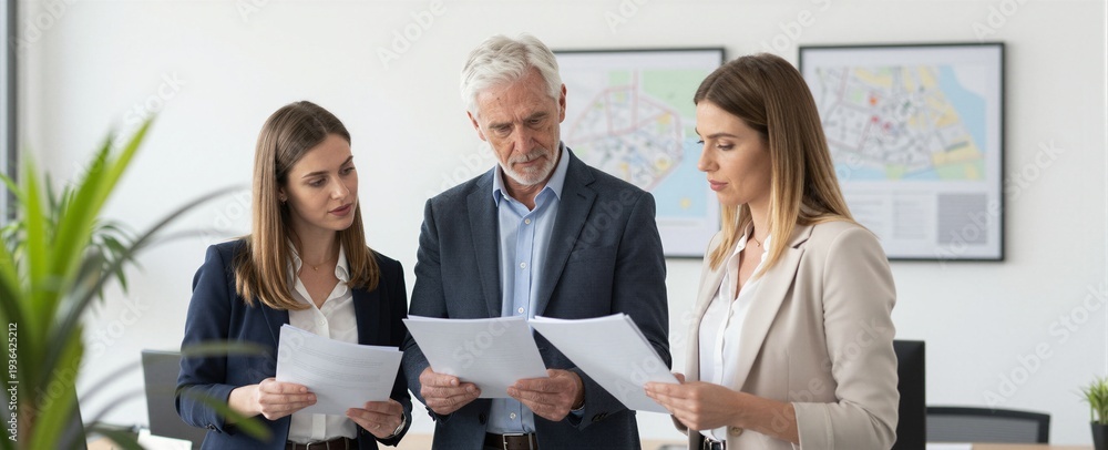 Professional business team reviewing financial reports and corporate documents for project management strategy #1936425212