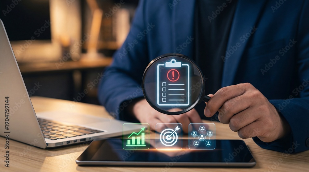 Professional businessman analyzing data analytics on a tablet with digital icons for targeting and performance metrics in a modern office setting. #1904759144