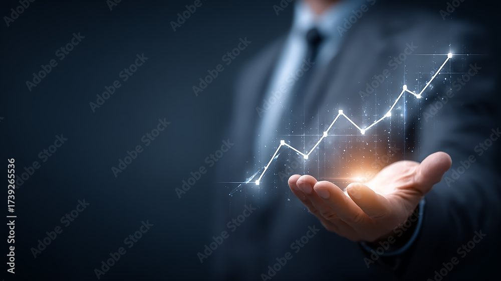 Professional businessman in formal suit holding a glowing digital graph chart with rising trend lines, modern office background, business growth concept #1739265536