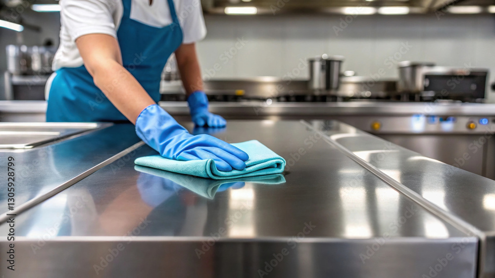 professional cleaner is wiping stainless steel kitchen surface with blue cloth, ensuring spotless and hygienic environment #1305928799