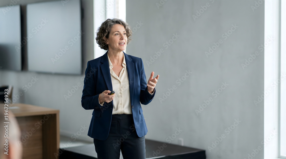 Professional female leader giving presentation in modern office space with empty wall for text overlay #1967254923