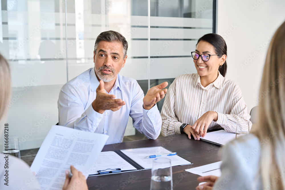 Professional international executive people working at team office meeting. Diverse busy corporate leaders managers discussing project management plan together in teamwork sitting at boardroom table. #616687218