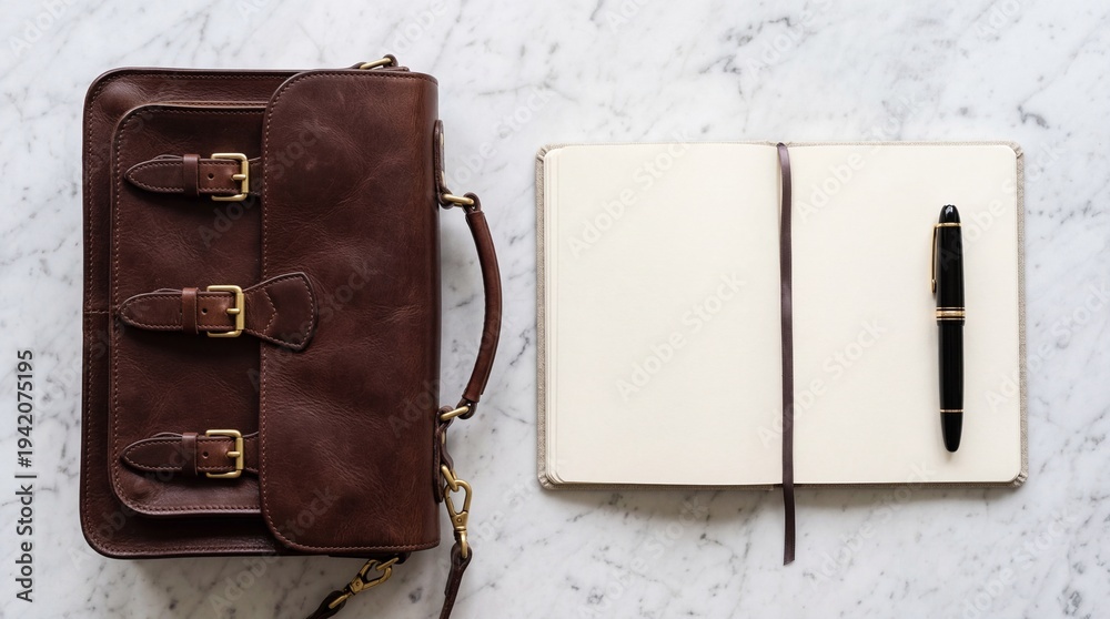Professional Leather Briefcase and Open Notebook on White Marble Workspace #1942075195