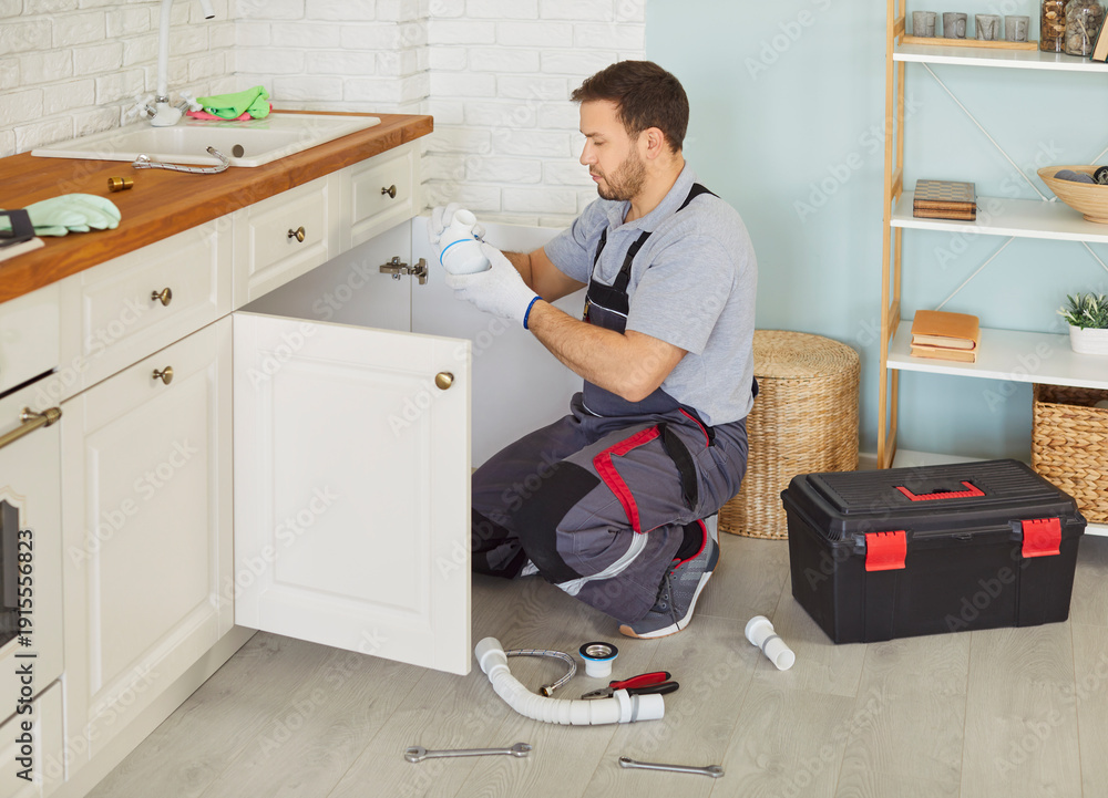Professional male plumber in uniform with toolbox sitting near sink replacing the water filter or fixing broken pipe in modern kitchen. Repair service and plumbing maintenance concept. #1915556823