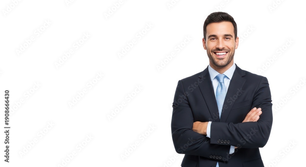 Professional man stands with arms crossed and smiles in a studio setting #1908666430
