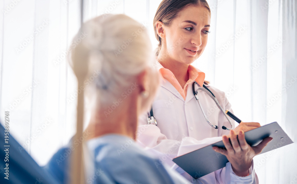 Professional Medical Doctor diagnosing and giving advice to the elderly patient at hospital. Healthcare homecare concept #1958892761