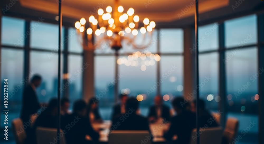 Professional Meeting in a Modern Boardroom with Chandelier and City View #1802273864