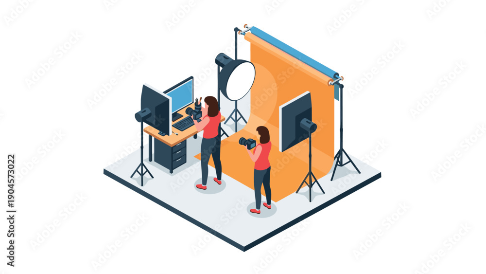 Professional photography studio setup in isometric style featuring photographers at work #1904573022