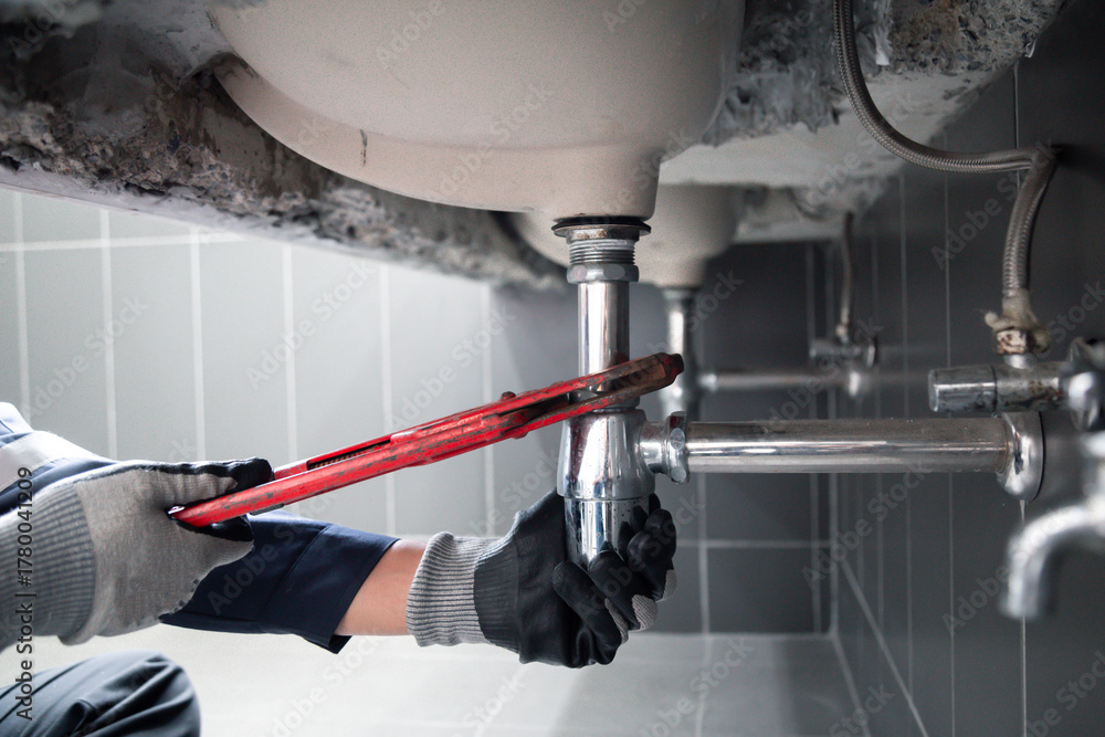 Professional plumber repairs damaged bathroom sink pipes to restore them to normal operation. Maintenance concept. #1780041209