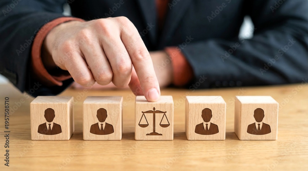 Professional's hand selecting a wooden block depicting scales of justice, symbolizing critical legal choices or ethical considerations. #1957508710