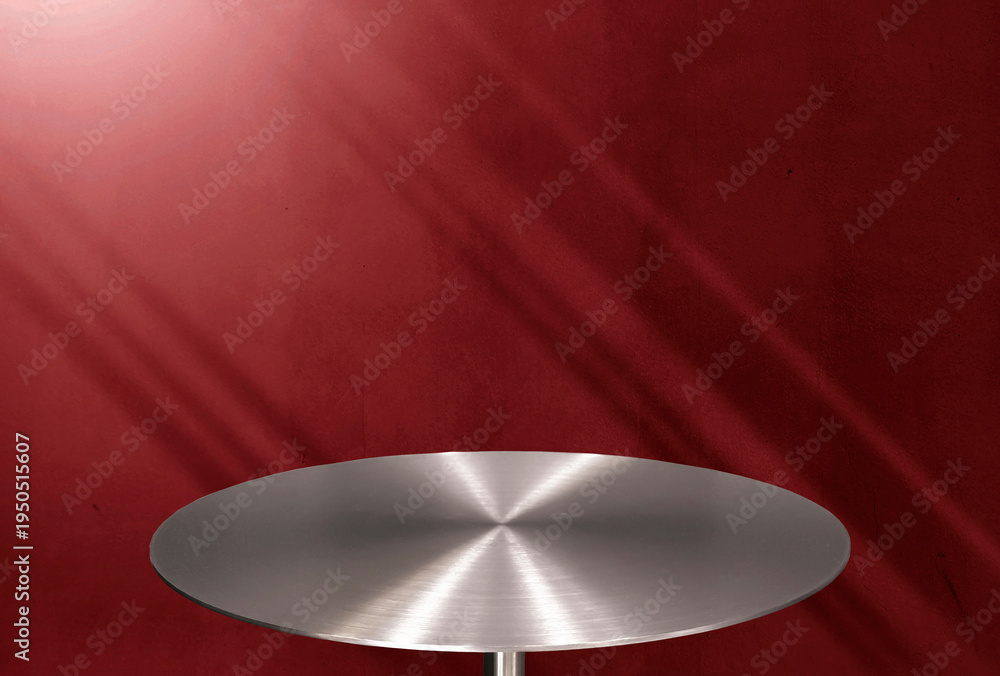 Professional studio product display podium featuring a circular brushed metal stainless steel table top against a textured deep red wall with dramatic light rays and moody diagonal shadows. #1950515607