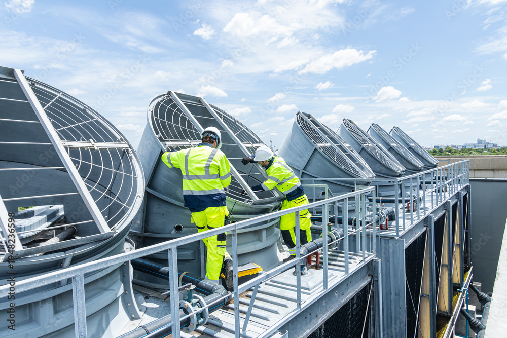 Professional Worker Teamwork Servicing HVAC building cooling tower, Industry air conditioner service #1948236598