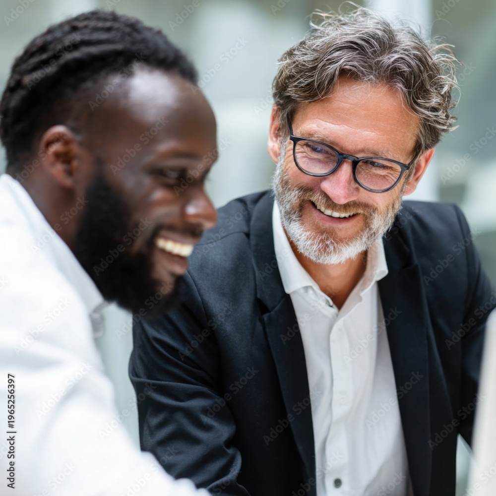 professionals wearing collaborate and talk at a modern office, showing teamwork, communication, and a positive work environment. #1965256397
