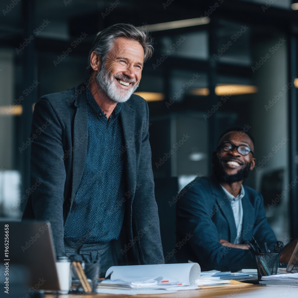 professionals wearing collaborate and talk at a modern office, showing teamwork, communication, and a positive work environment. #1965256658