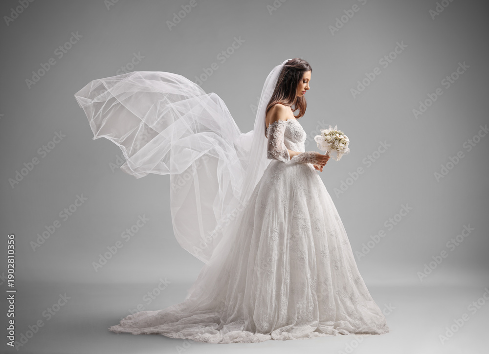 Profile shot of a bride in a lace off-the-shoulder wedding gown #1902810356