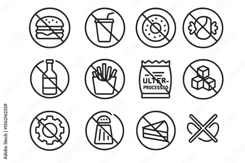 Prohibited foods icon set: unhealthy snack and drink warnings #1562162339