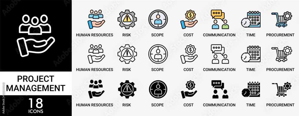 PROJECT MANAGEMENT icon set with various styles and colors of scope, human resources, time, communication, quality, cost, procurement, and risk #1515991941