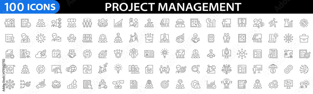 Project management 100 line Big icon set. Time management, strategy, planning, task, scope, scheduling, budget, teamwork, working, manager and more. Vector illustration #1793427112