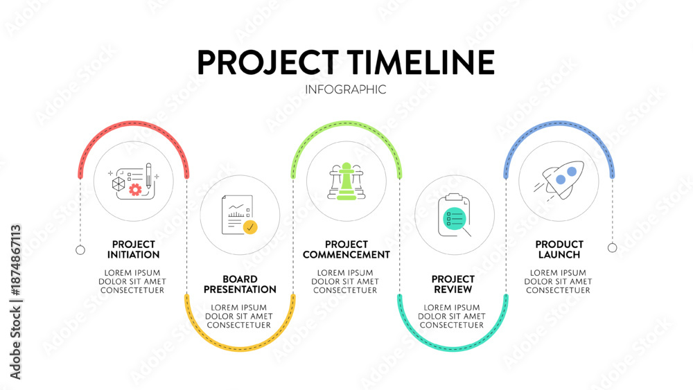 Project Timeline Infographic Vector Template 5 Year Business Roadmap Diagram from 2022 to 2026. Phases include Initiation, Presentation, Commencement, Review, Product Launch Strategic Management Slide #1874867113