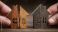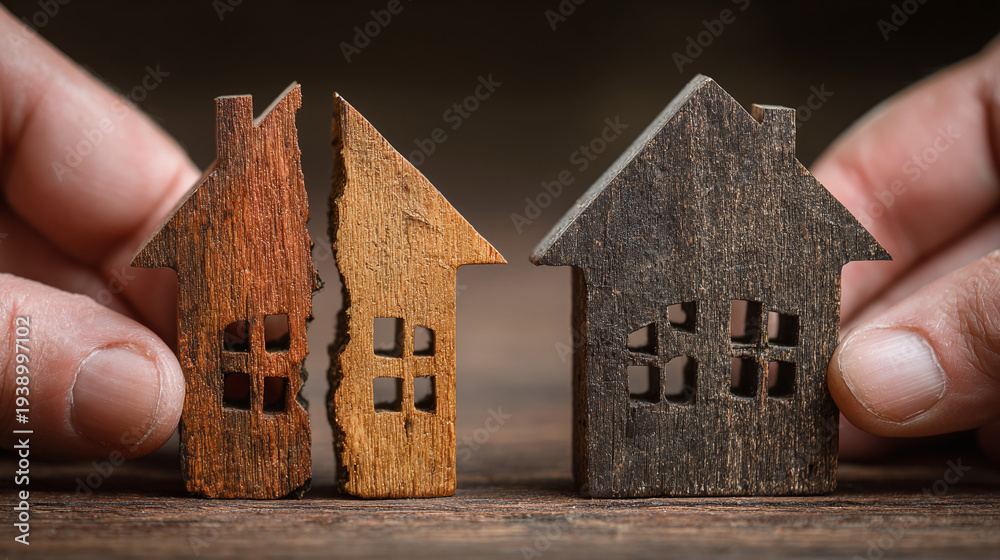 property division concept showing hands pulling apart two wooden houses to illustrate divorce settlement real estate separation legal dispute and split home ownership #1938997102