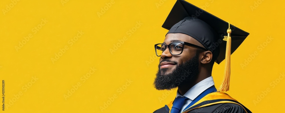 Proud young african male graduate with beard and glasses on yellow background #1215502289