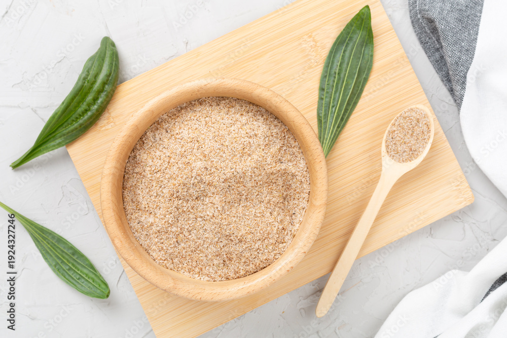 Psyllium husk powder with fresh leaves on concrete background, top view #1924327246